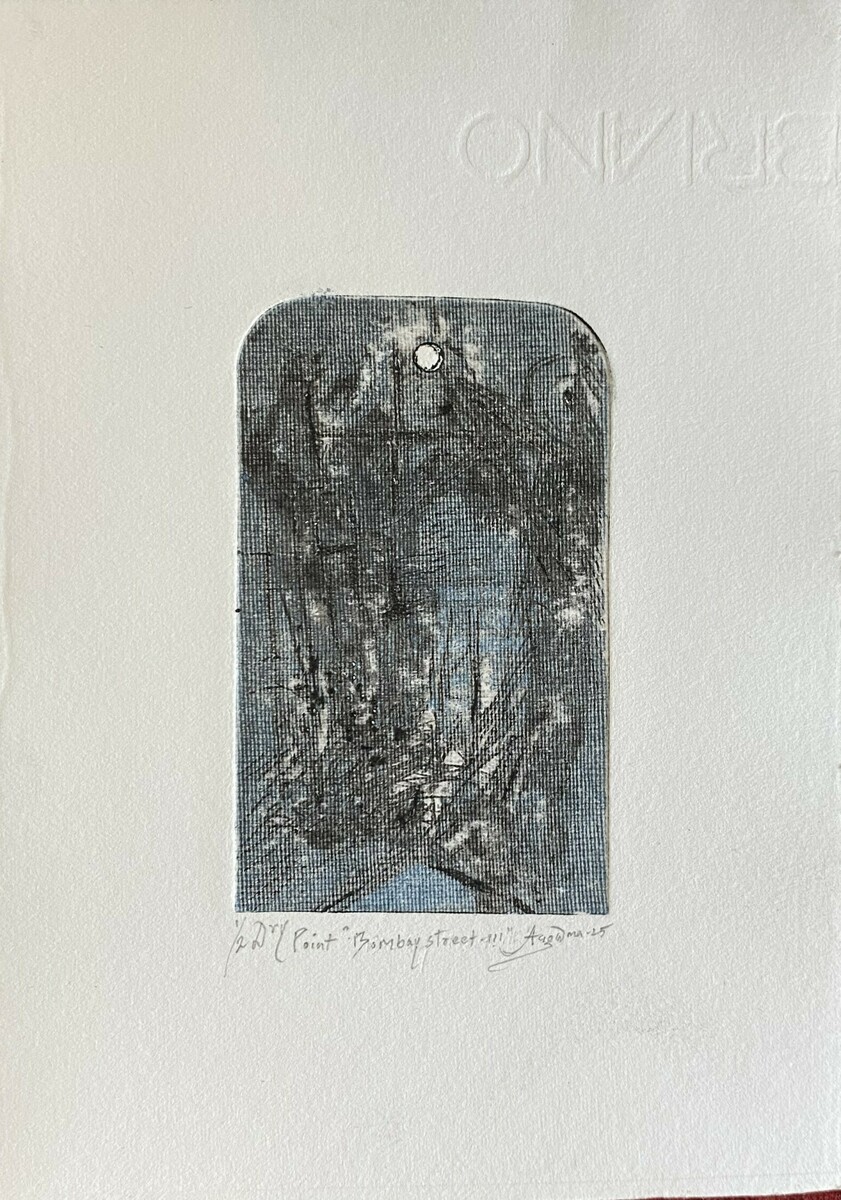 Working primarily with drypoint printmaking, Agwma gives form to moments that have moved him turning memory into living impression. He collects discarded materials like visiting cards, credit cards, and other found objects, using them as essential tools in his creative process.These materials, rich with their own histories and textures, add depth and meaning to his prints. His work becomes a quiet documentation of personal journeys and encounters, where memory acts both as witness and guide.