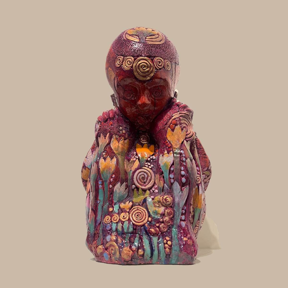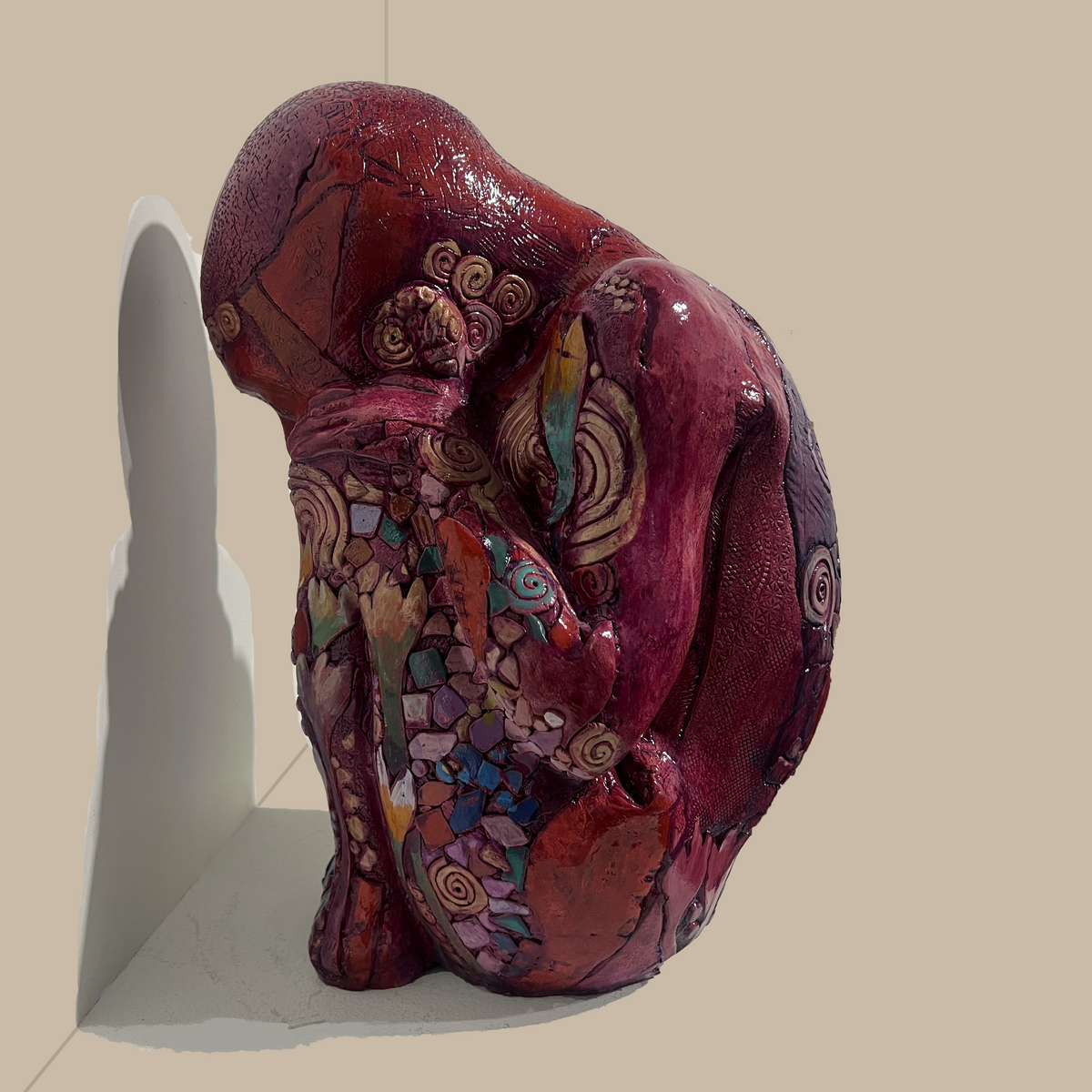 The set of five mixed-media sculptures draws from the Pandavas of the Mahabharata, reimagined not as warriors or historical figures but as archetypal energies in a pre-natal state of becoming. Curled inward like foetuses, the forms appear suspended in the womb, evoking the very beginning of human life—before identity, action, or destiny take shape. Intricately patterned and rendered in elemental tones, the sculptures merge mythological memory with universal themes of birth, consciousness, and potentiality.