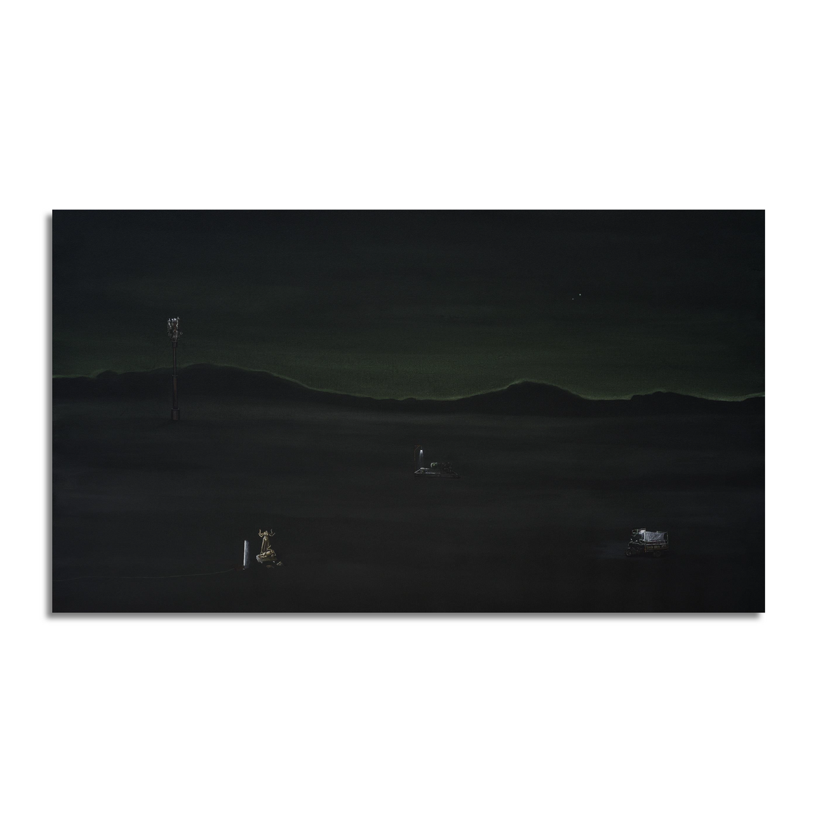 This painting brings together diverse forms from various places, reflecting my travels since graduation. Each location introduced me to warm and welcoming people, and these collected images now coalesce to evoke a serene narrative, capturing the essence of peaceful nights.