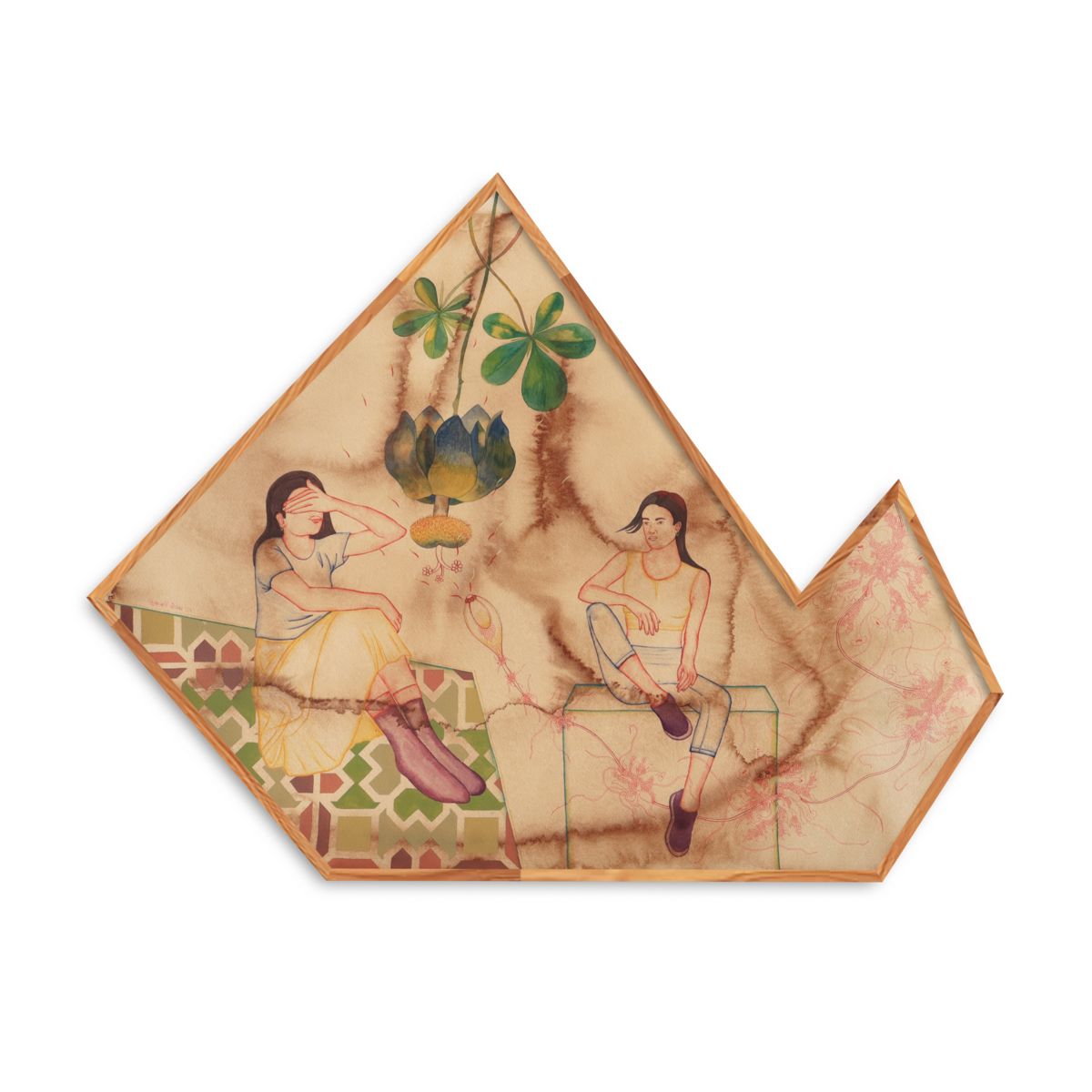 The emotional highs and lows of my life are embedded within these structures. Small narratives unfold inside them, and often two phases of myself appear—sometimes as a solitary figure, and at other times as a pair: one representing me, and the other my shadow. Through these relationships, the compositions come together.