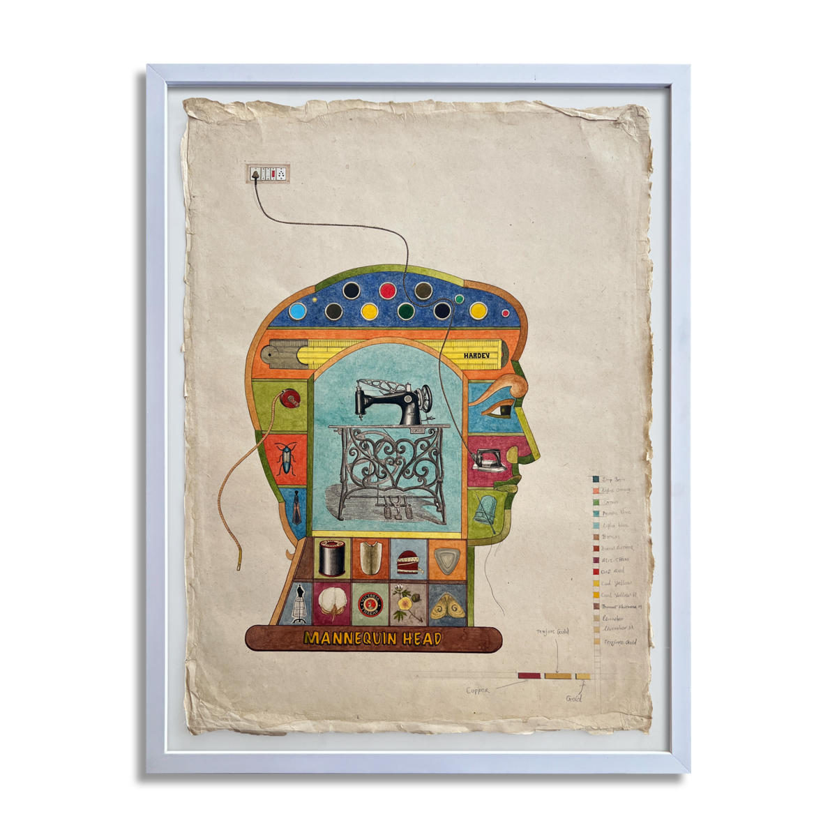 At its core, the sewing machine becomes a symbol of both manual labor and creative agency. Surrounded by objects such as thread, spools, buttons, measuring tapes and pattern references, the painting maps the internal anatomy of a working mind shaped by craft. The power plug emerging from the head suggests how external systems-industrial, capitalist, or technological-can direct, consume, or sustain creative energy.
