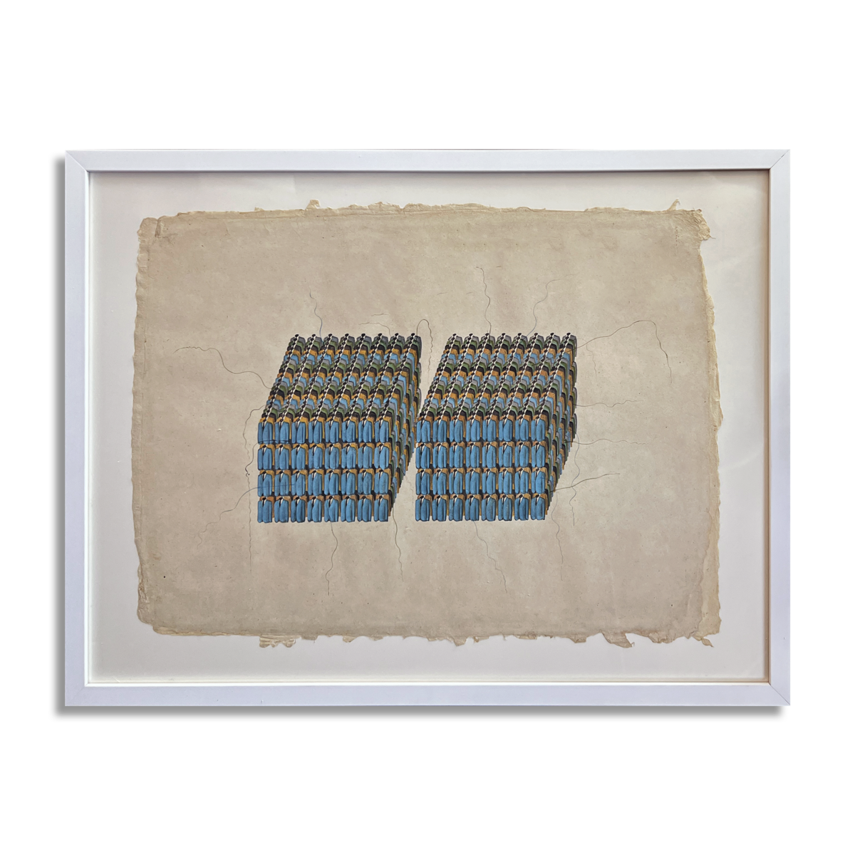 Business of cotton reflects the journey of cotton from raw fiber to tailored suits, symbolizing the unseen labor and industrial systems behind clothing. The stacked forms resemble folded suits, representing mass production, trade, and the transformation of cotton into a symbol of status and power. This work invites us to consider not just what we wear, but the complex business and human effort woven into every thread.