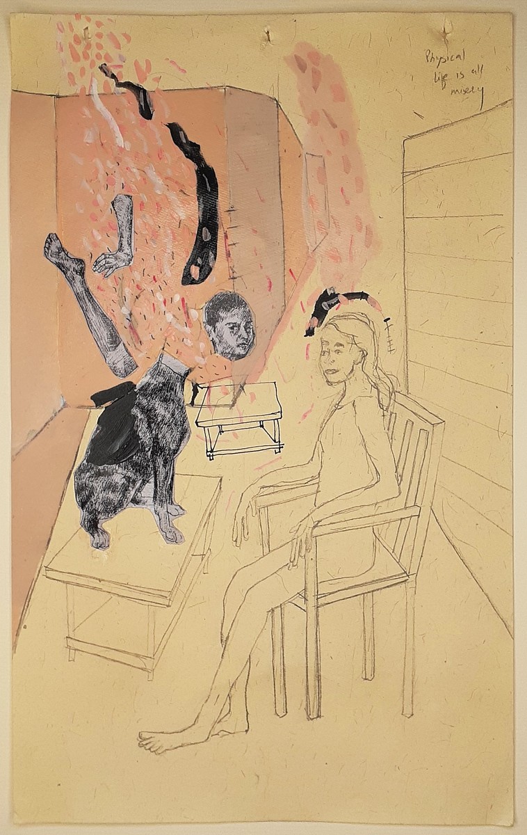 The artwork depicts a figure seated on a chair facing dismembered body parts and a headless dog that questions the ideas of equality and suppression of women's emotions in society.
