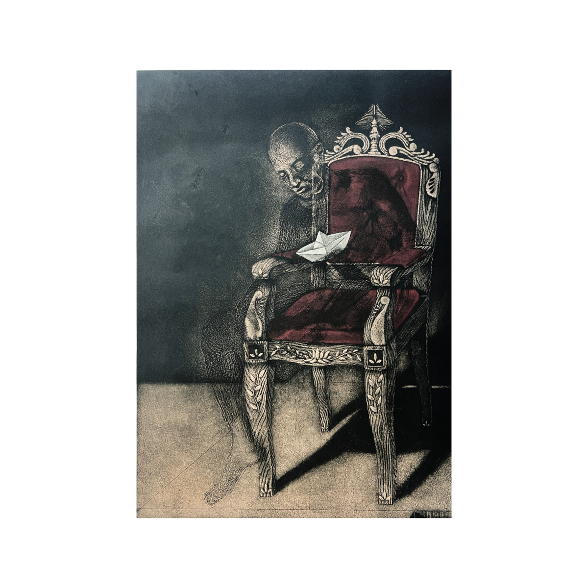 Deeply connected to his ancestral craft of pottery and terracotta, Yogesh explores themes of cultural memory, fading traditions, and the changing identity of his community. His compositions confront social stereotypes and unspoken realities, allowing viewers to resonate with these shared human experiences. Working primarily with intaglio and installation, Yogesh uses etched surfaces to symbolize the scars of societal structures, while installations made with familiar materials create an immersive dialogue between memory, material, and meaning. His recurring imagery of watchful eyes and paper boats reflects both the resilience and quiet struggle of potter communities whose identities often remain unnoticed.