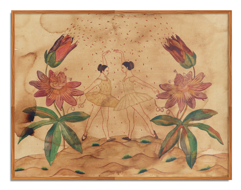 Botanical forms grow alongside the body, not as dominance but as mutual protection—mirroring emotional states and stages in a woman’s life.