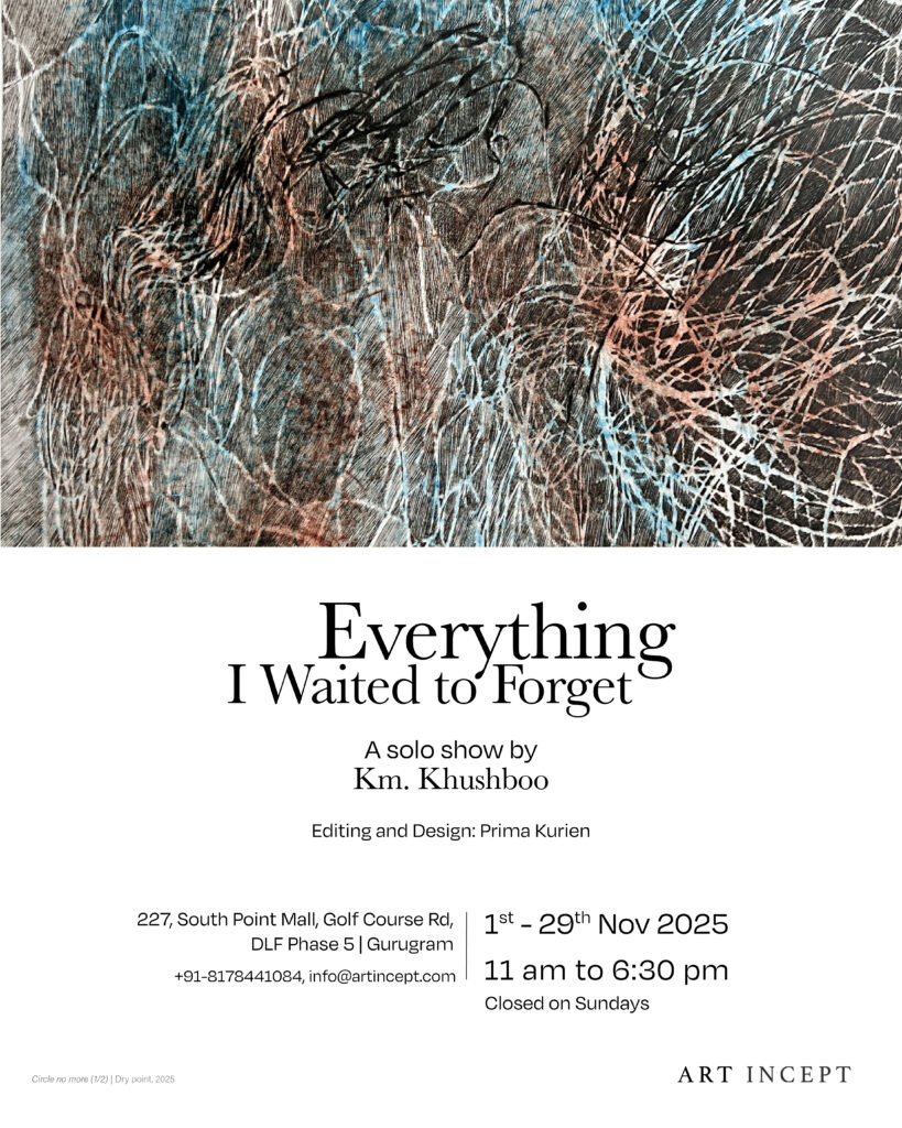 Art Incept is delighted to announce Everything I Waited to Forget, a solo exhibition by Km. Khushboo, Design and Edit by Prima Kurien. The exhibition brings together a body of prints that reflect her meditative engagement with life, death, and transformation.