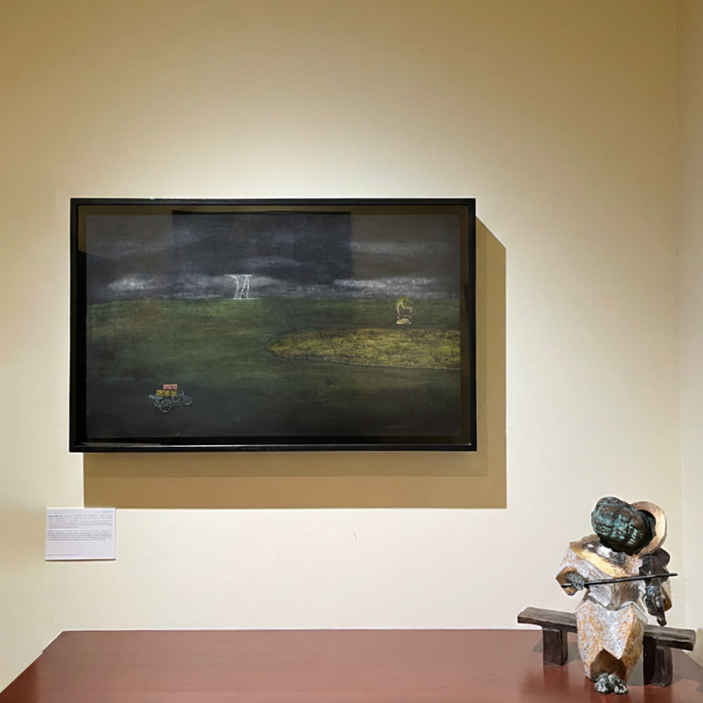 One painting rests above a console, at first glance a lovely yet slightly strange landscape. Whispers of nostalgia breathe life into it, as the artist’s memories of Baroda’s nights merge with Tripura’s tranquil vistas. Lily leaves dance across the lake, fish crates await their journey, and a distant storm gathers, cleansing the atmosphere. The juxtaposition of these moments captures both the fleeting and cyclical rhythms of life — and in this unassuming corner, the painting invites pause, reflection, and connection on the viewer’s own terms.